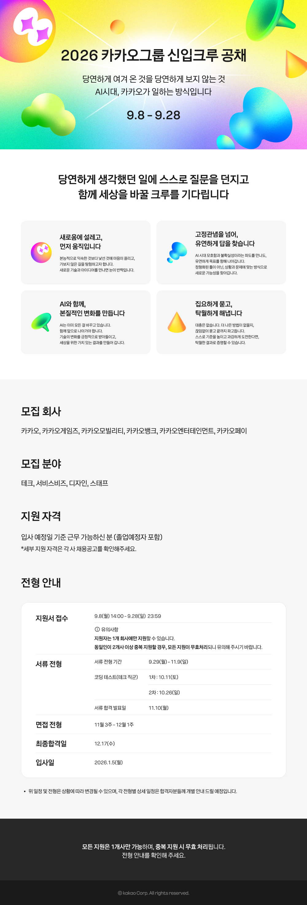 [카카오그룹] 2026년 신입크루 공채(~9/28(일)까지)